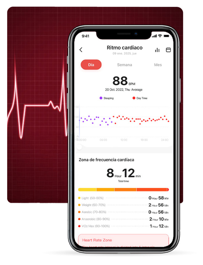 El sensor óptico de oxígeno en sangre de alta precisión puede medir el nivel de oxígeno en sangre mediante la emisión de luz roja e infrarroja, y permite el monitoreo de oxígeno en sangre las 24 horas.